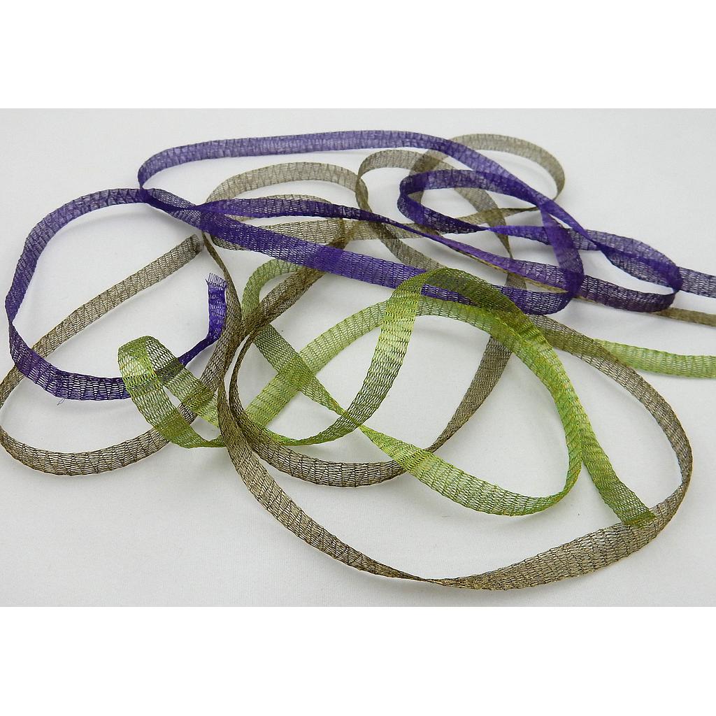 Rondgebreid metaalband van 5 mm. breed. Dit van dun metaaldraad gebreide band kan als kous tot 35 mm. worden uitgerekt om er sieraadonderdelen in te doen. Door de open structuur wordt het ook goed in viltwerk opgenomen. De prijs is per meter.