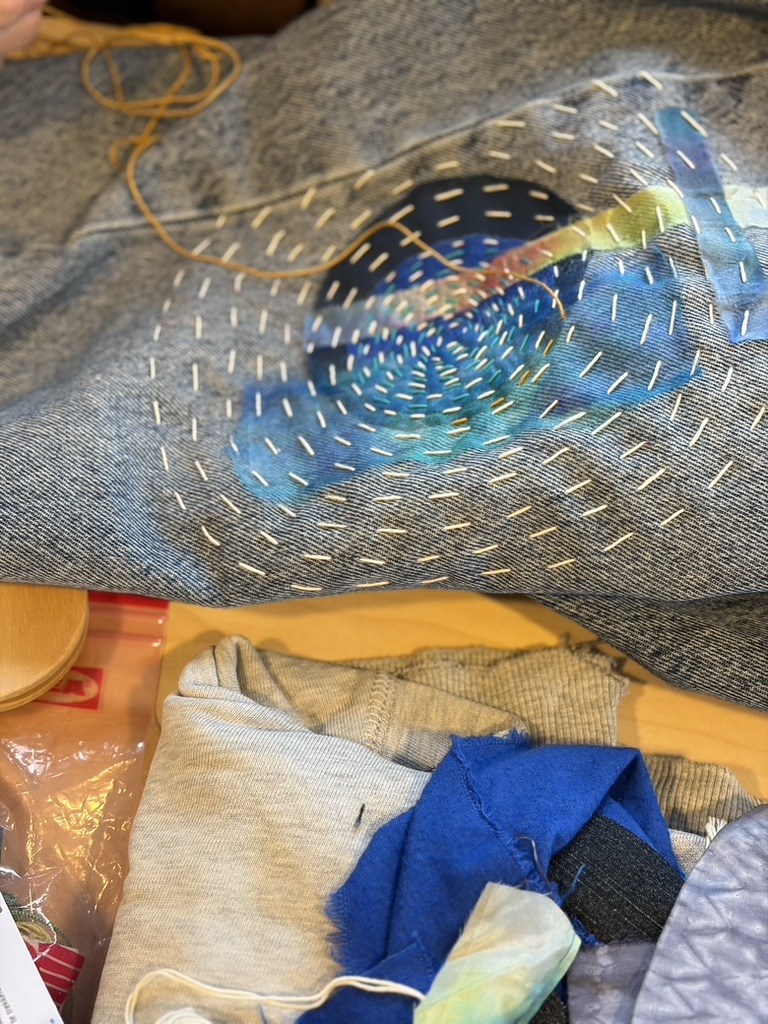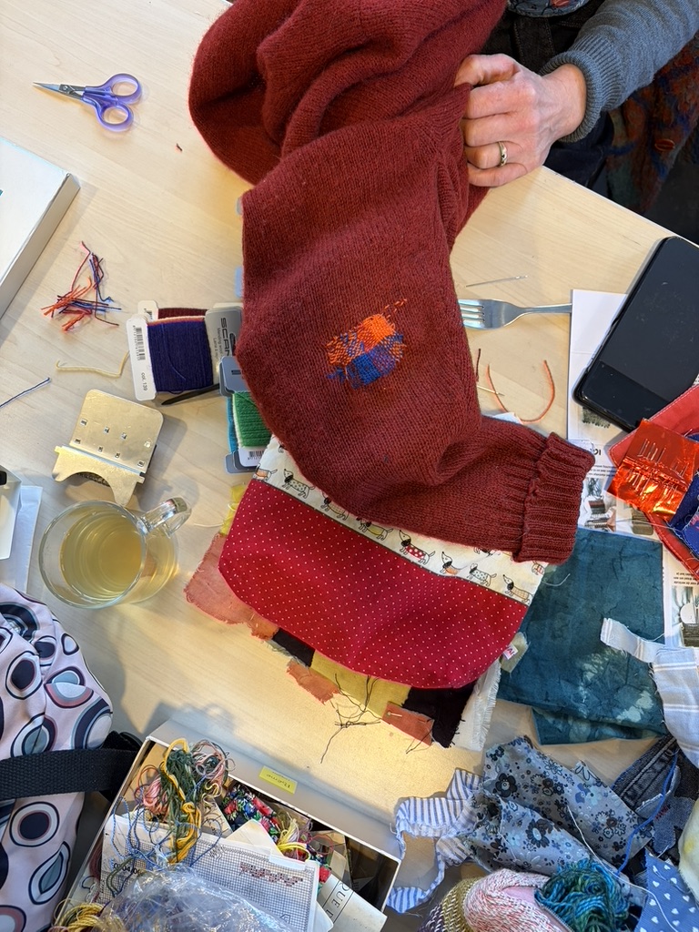 In december stond er een hele dag in het teken van Modern Stoppen. Het was inspirerend om te zien hoe gaten en slijtage in kleding niet werden verborgen, maar juist gevierd met kleurrijk stopwerk. De resultaten van de cursisten lieten zien dat het herstellen ook een vorm van kunst kan worden; duurzaam, creatief en heel persoonlijk. En we hadden weer eens een man in atelier, erg leuk!
