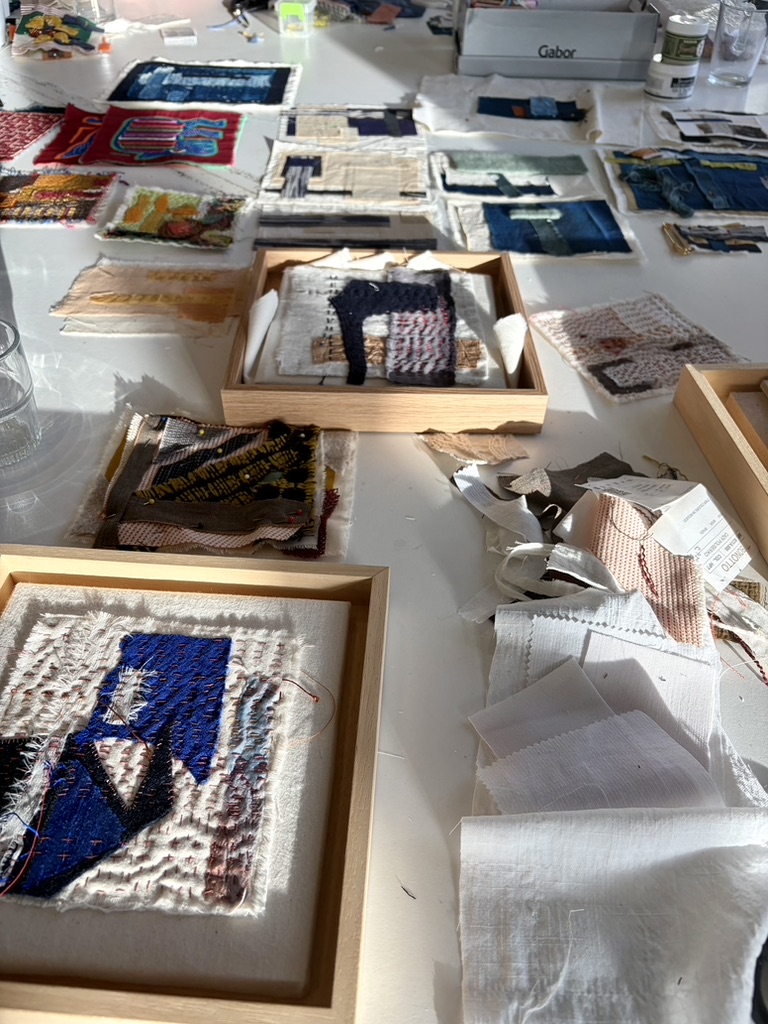 Tijdens de workshop Textielcollage doken we in de wereld van compositie en balans. De deelnemers werkten met verschillende stoffen en kleuren om tot een gelaagd beeld te komen. De voorbeelden die in het atelier ontstonden, gaven een prachtig inkijkje in de eindeloze mogelijkheden van collage. Tijdens deze workshop is iedereen in het begin altijd een beetje onwennig, niet wetende wat er precies gaat komen. De deelnemers volgen mijn aanwijzingen en dan ontstaan er toch echt altijd leuke dingen en verrassingen! En aan het einde van de dag is bij iedereen een ontwikkeling te zien van de eerste collage naar het gene wat in de middag is gemaakt, erg leuk en inspirerend!