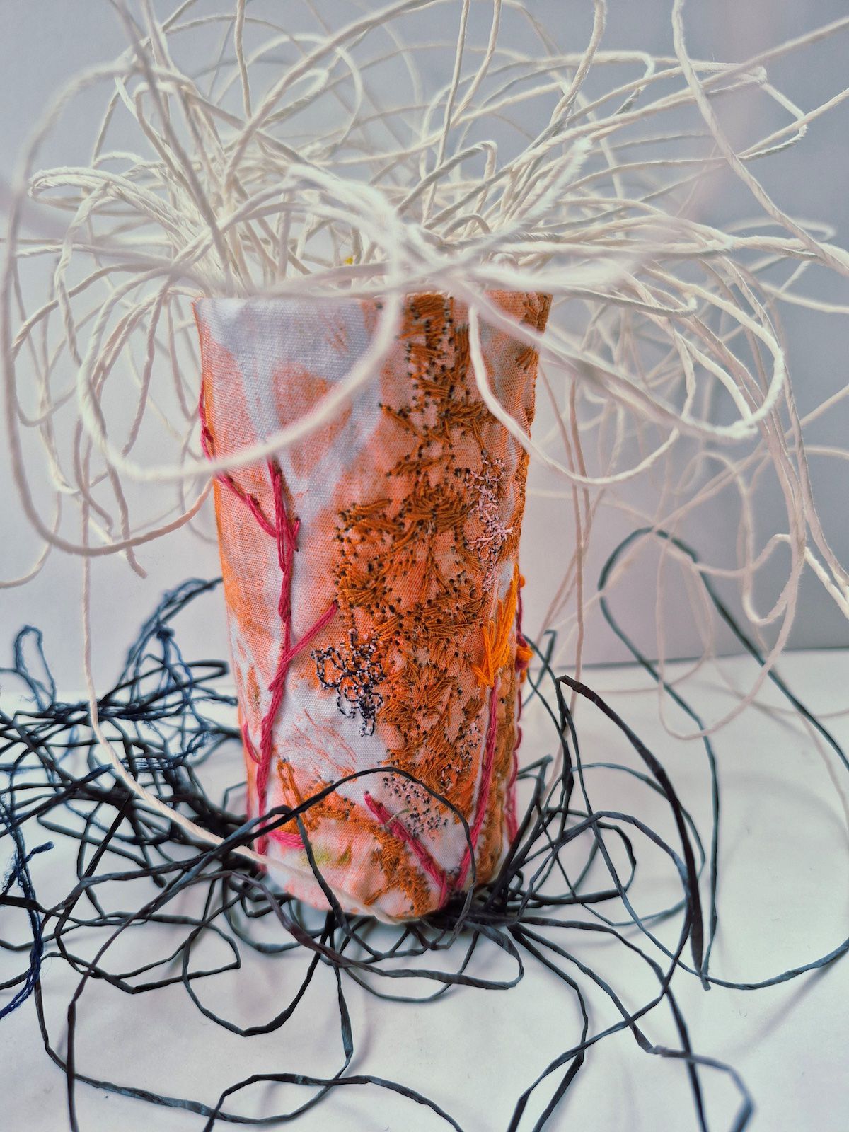 I favor "slow, rounded" processes. I often begin with raw materials, followed by dyeing, printing, painting wool and fabrics, spinning or weaving, sewing together, taking apart again (deconstruction), and reshaping. The subsequent embroidery serves as the integrating factor, bringing everything together: lines, surfaces, connections, and cohesion.