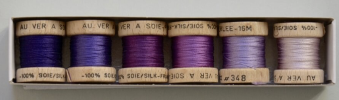 Het Soie Perlée pakket bevat 6 houten klosjes met elk 16 meter Soie Perlée garen.