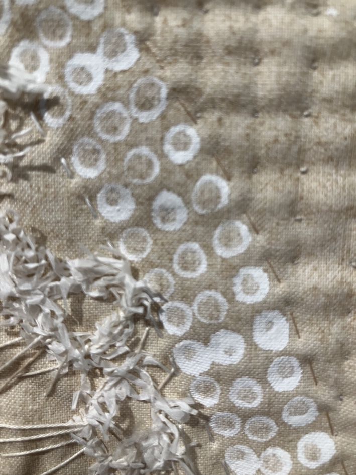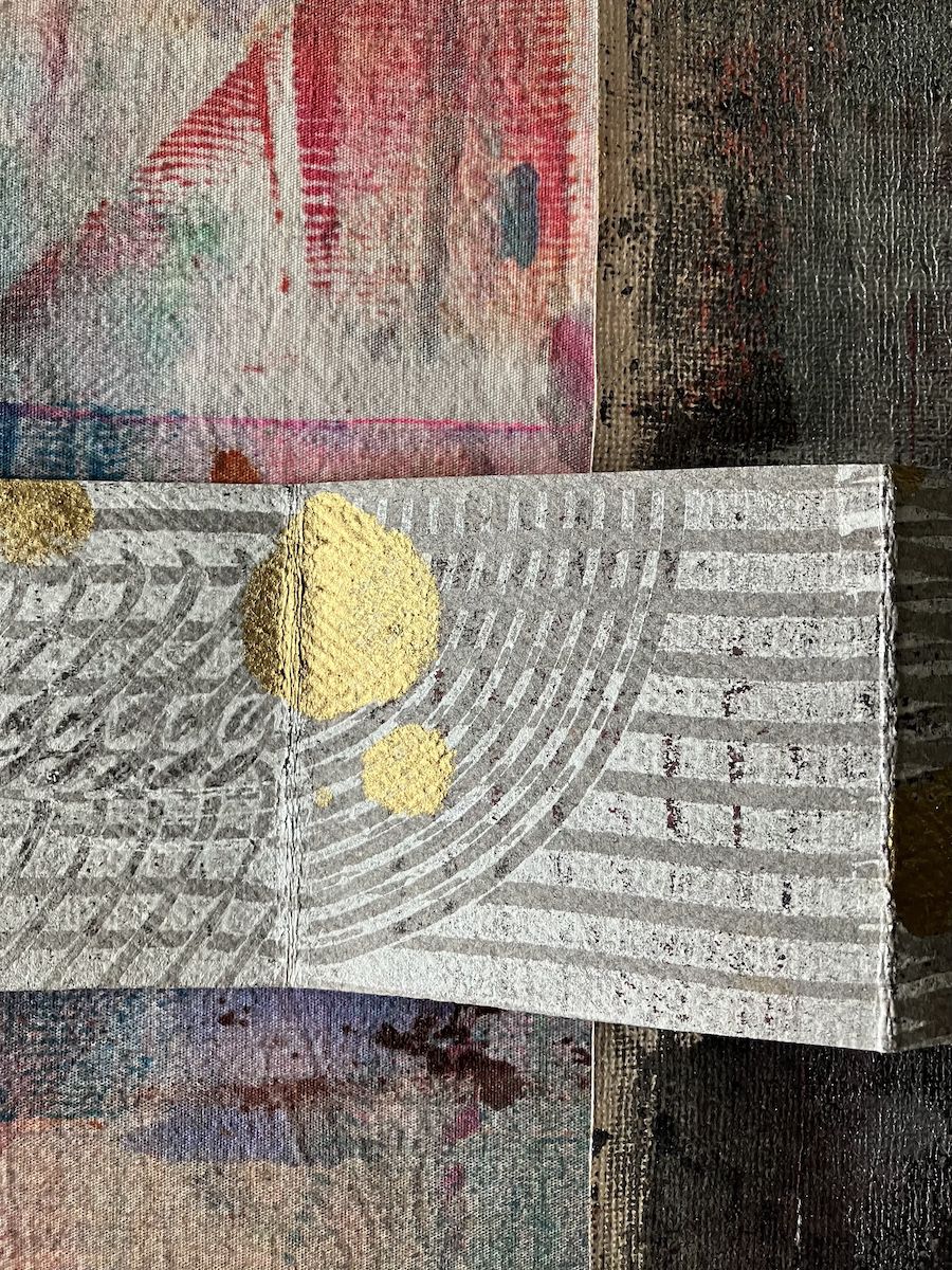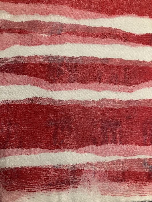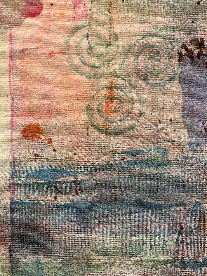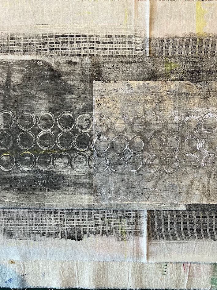 Daarna kun je een keuze maken: doorgaan met alle mogelijkheden of kiezen voor een bepaalde techniek om daar dieper op in te gaan en variaties te bedenken. Ondertussen kun je je gedachten laten gaan om toepassingen voor je prints te bedenken. Het kunnen bijvoorbeeld ondergronden worden om verder op te werken met nog een drukgang of vrij hand- of machineborduurwerk. Of ze zijn misschien geschikt om in een kledingstuk te verwerken of ander textielwerk dat je onderhanden hebt. Of je hebt een verkleurde lap of een ‘mislukt’ verfexperiment dat je een tweede kans wil geven.