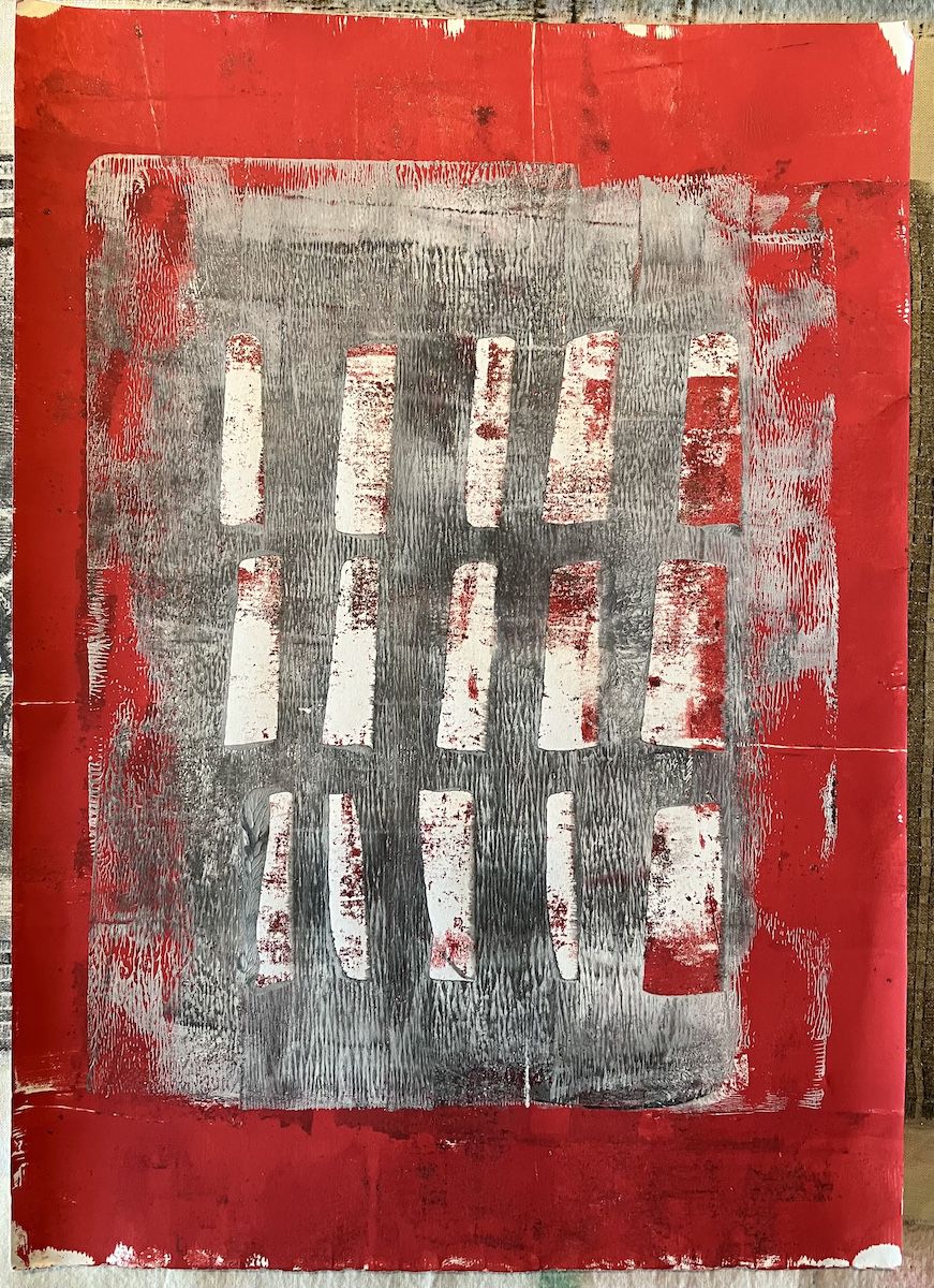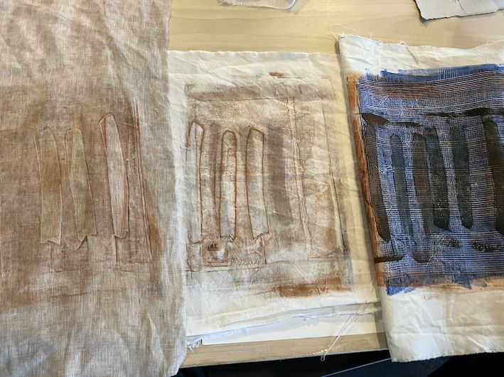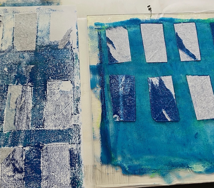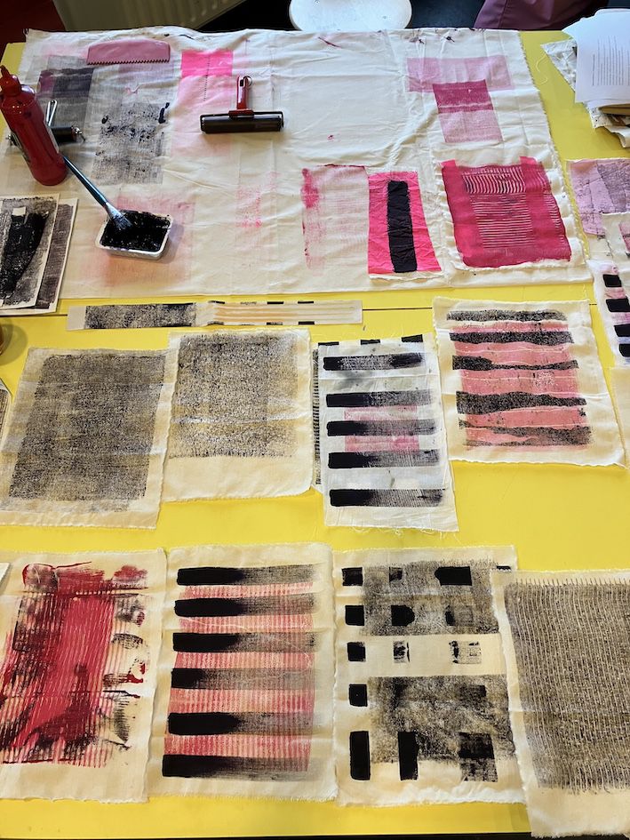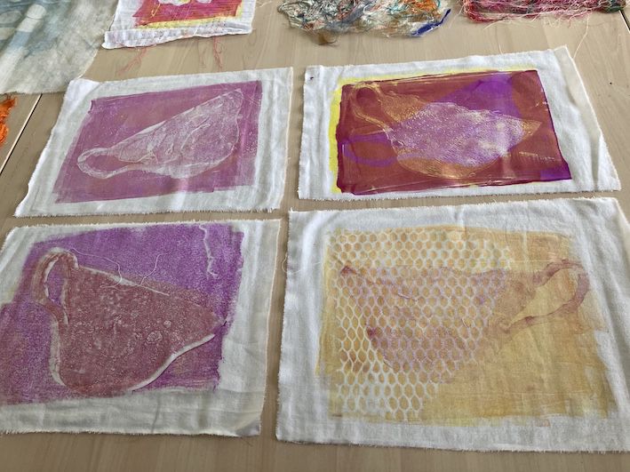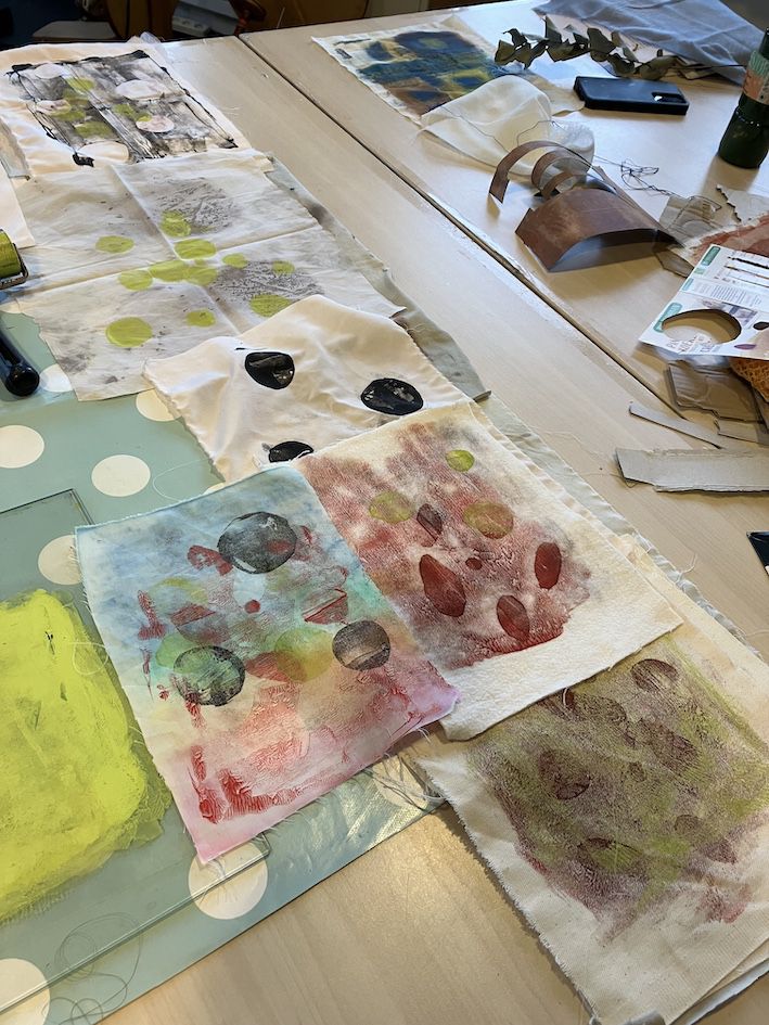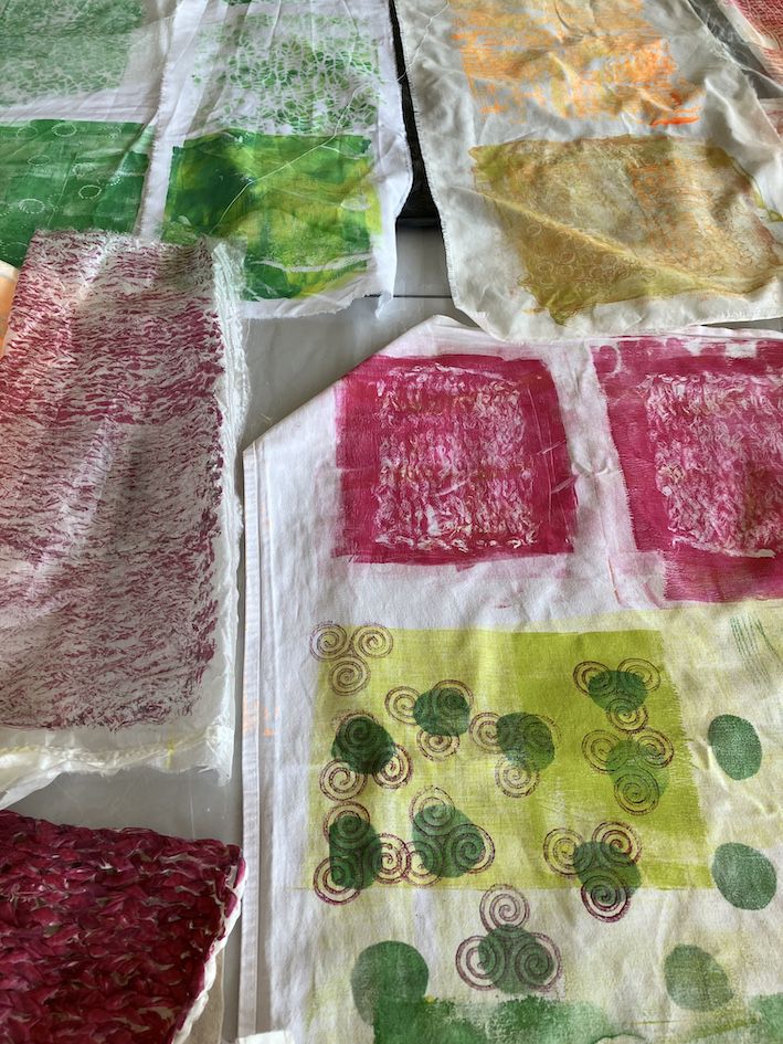 We werken deze dag met de gelliplate en een harde (glas)plaat. We maken gebruik van zelfgemaakte stempels en sjablonen. En we werken met een roller en stempels direct op verschillende soorten stof en papier.