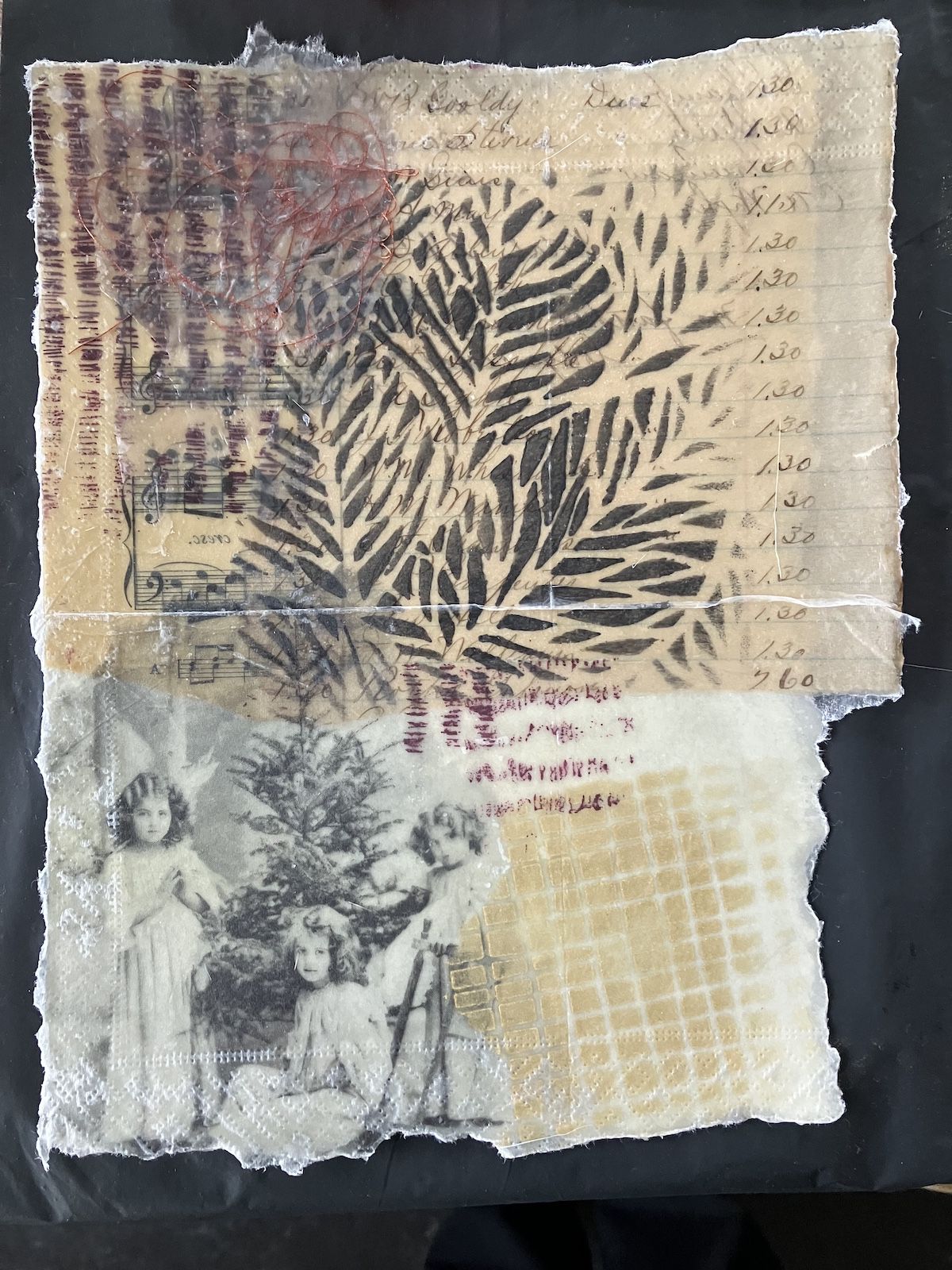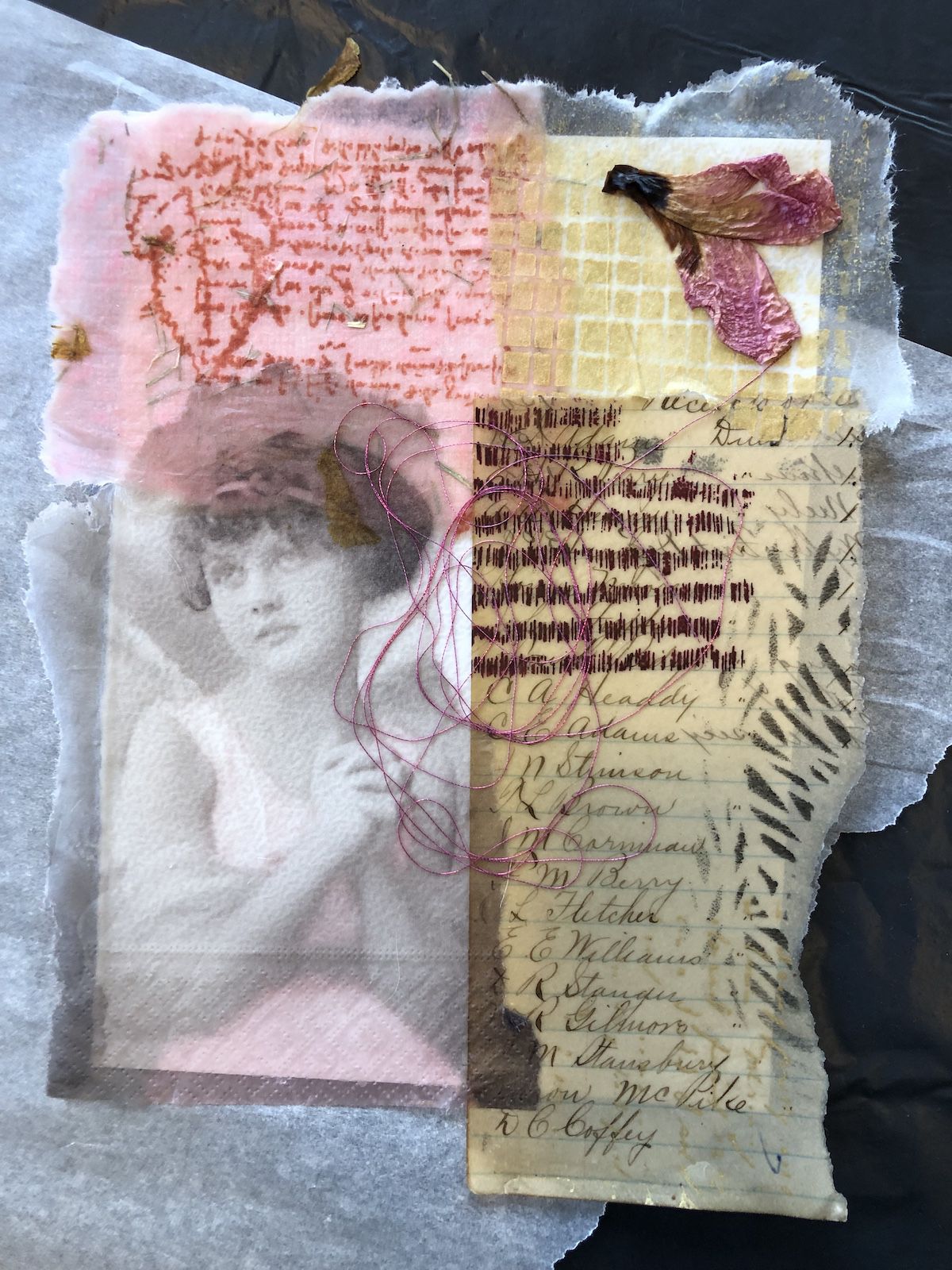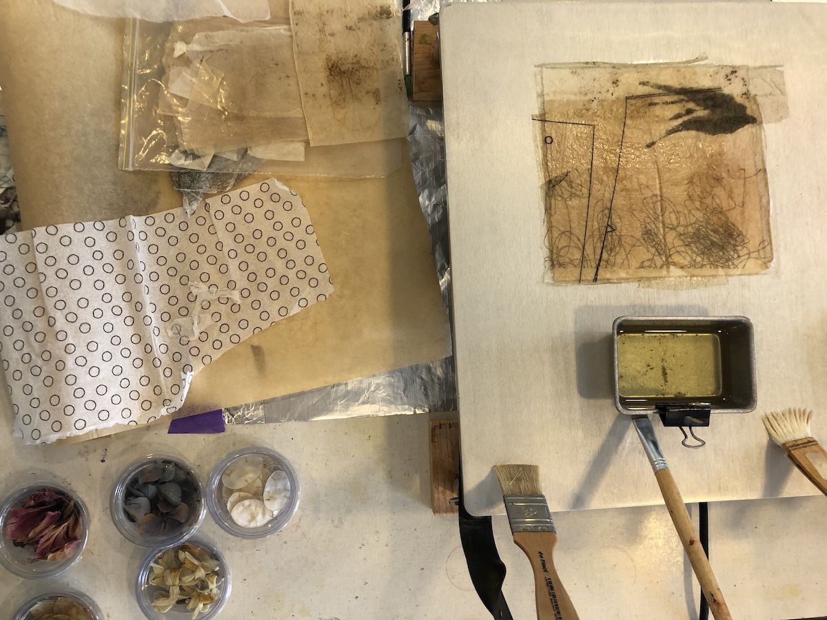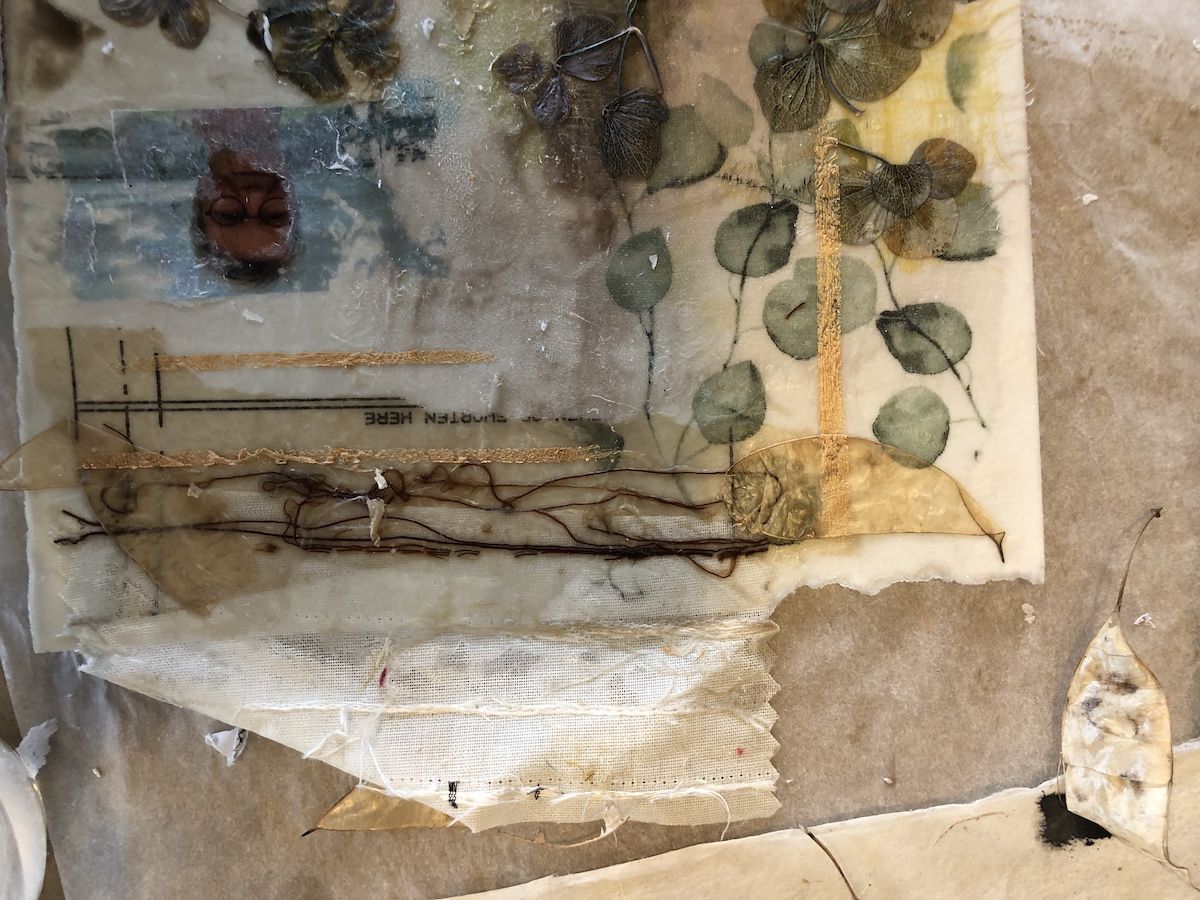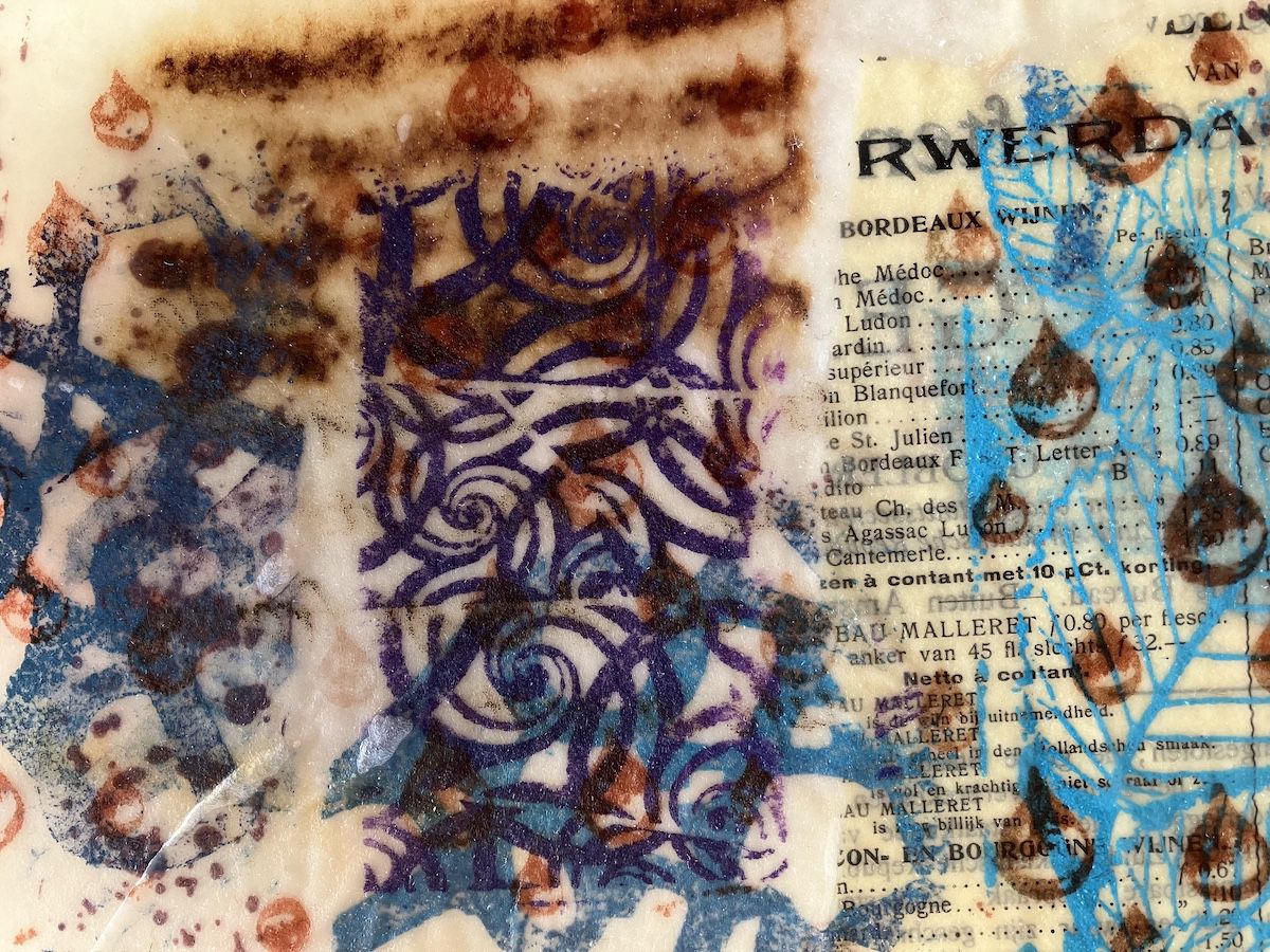 Daarnaast werken we met encaustic-technieken en creëren collages op een warme smeltplaat met aquarelpapier als basis en encaustic medium als bindmiddel. Door lagen van bewerkt papier toe te voegen, ontstaat diepte, en natuurlijke materialen zoals gedroogde bloemen en blaadjes zorgen voor textuur. Decoratieve servetten bieden extra kleur, en we voegen details toe door folies, tekenen met Indische inkt of carbonpapier, en zelfs hand stiksels..