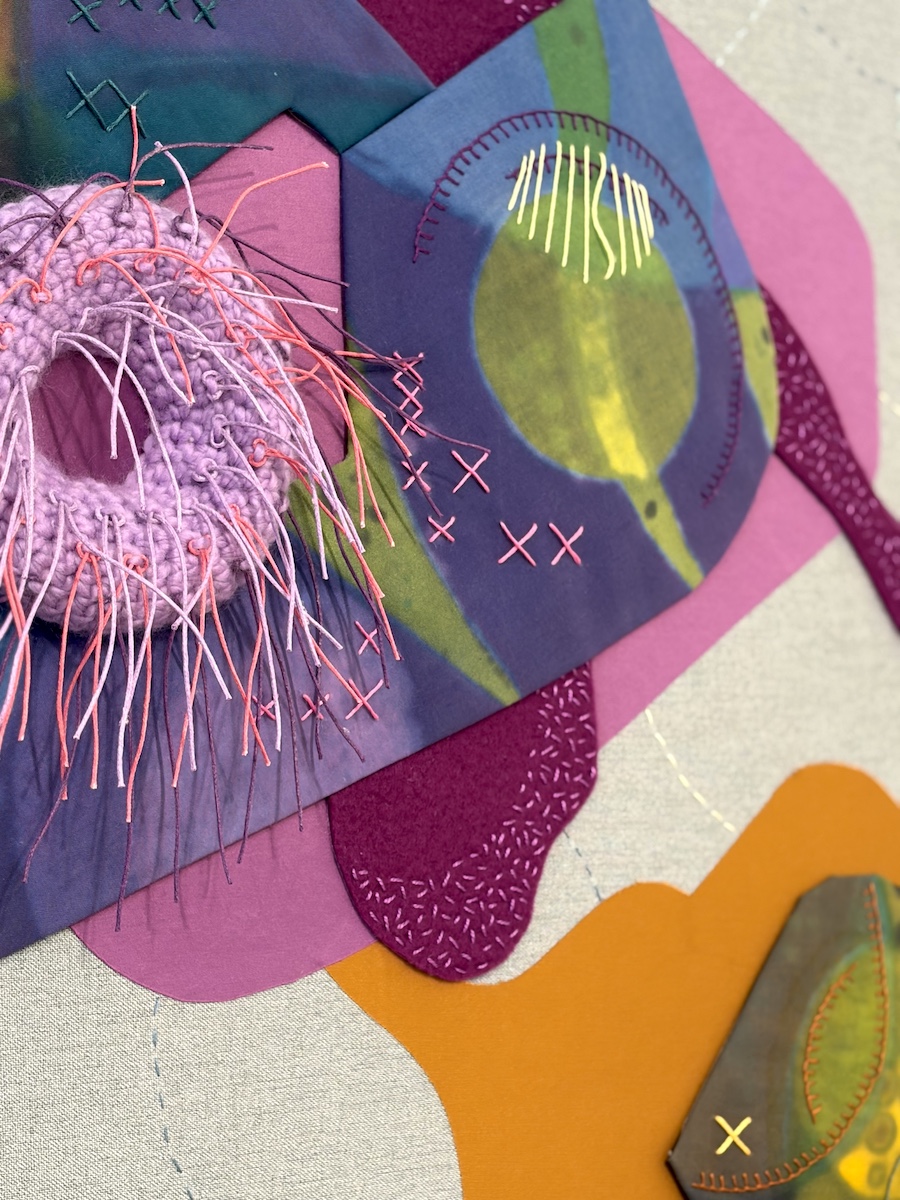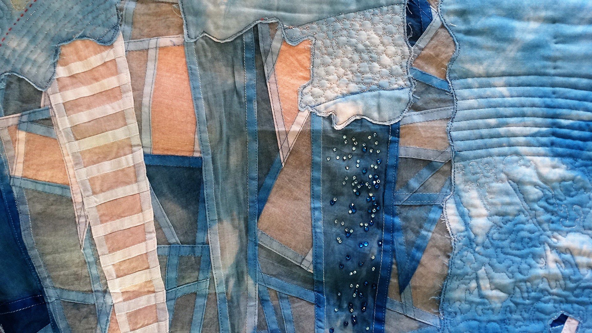 Een jaar of tien geleden werd ik webredacteur bij het Textielmagazine Vezel. Ik ben me gaan verdiepen in allerlei textieltechnieken, borduren, monoprint, composities maken met stof en papier, cyanotype en verven met indigo. De eerste docent, die me enthousiast maakte om hier zelf mee aan de slag te gaan, gaf les in Oldeberkoop bij Hawar. Een instituut, dat me nu de gelegenheid geeft te laten zien wat ik met textiel kan. Mijn schilders achtergrond blijft zichtbaar in mijn werk.
