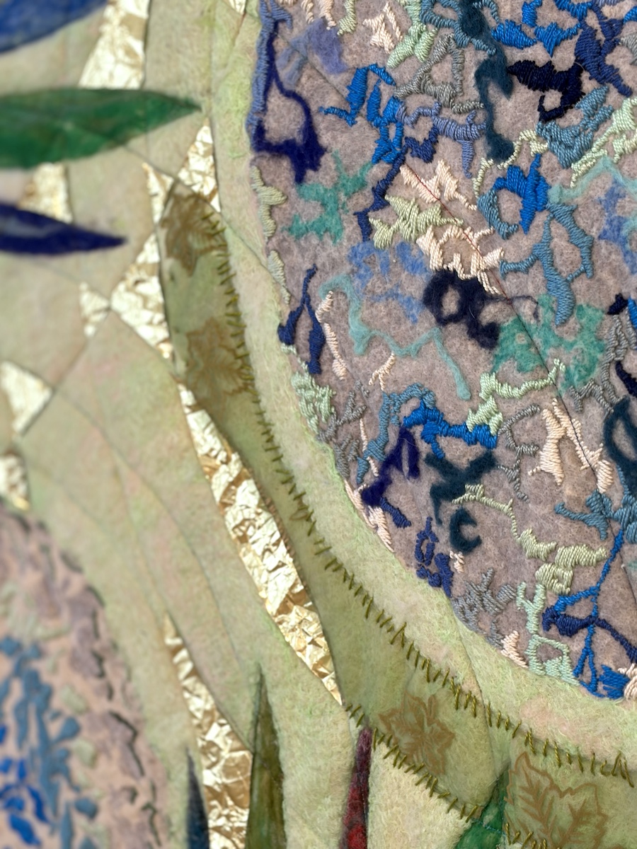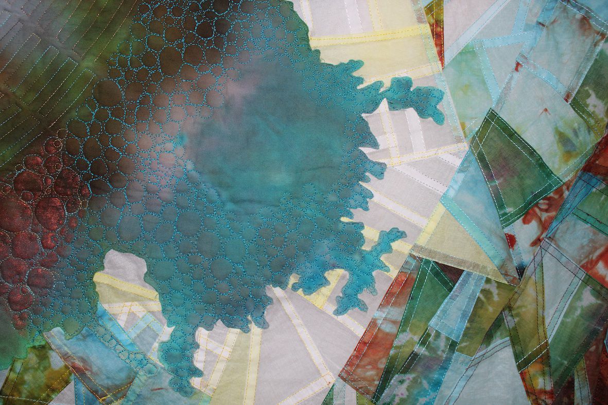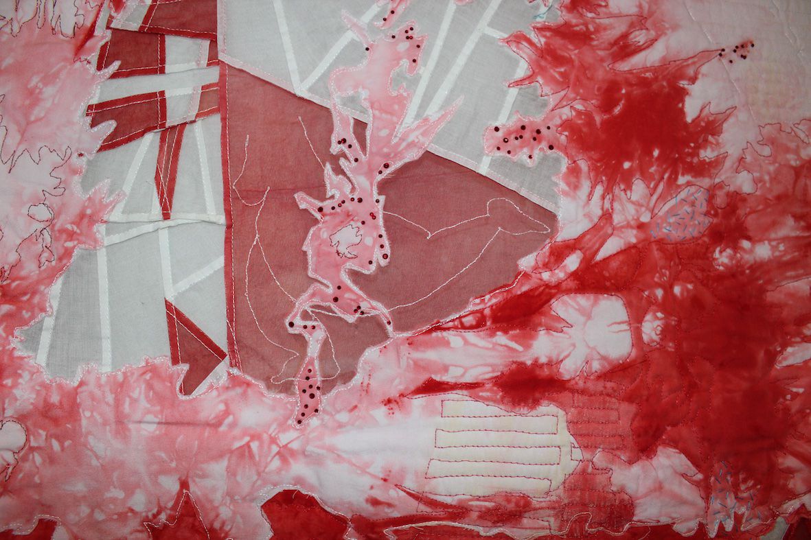 In mijn werk “Tussen nacht en dag” is het spel met blauwe en rode vormen doorbroken door het kleine groene vlak. Het symboliseert het begin van de ochtend, ik verlaat het dromende land. Met stof, verf, naald en draad is het me gelukt om een beeld te scheppen dat meer is dan vorm en kleur alleen. Het is een werk dat me raakt.