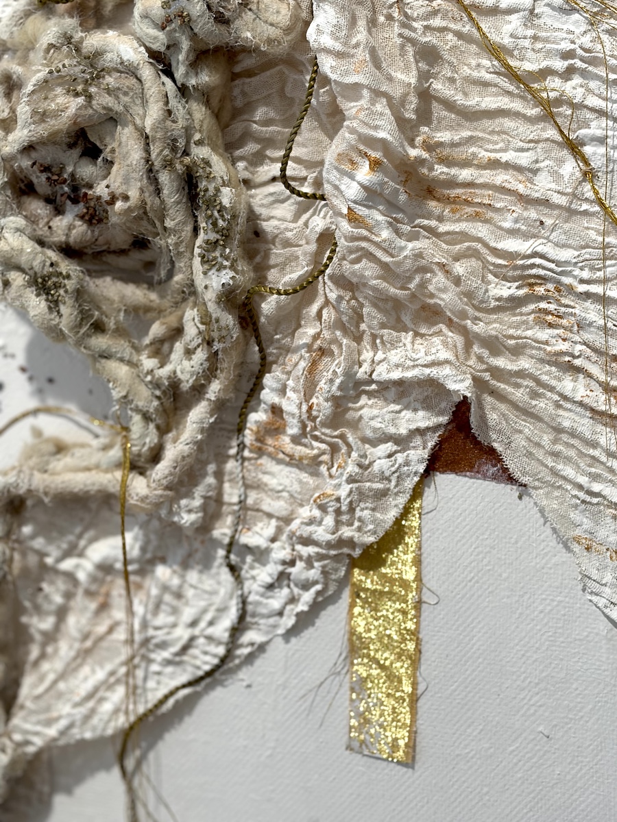 In de galerie staat haar nieuwste werk 'Cocoon' centraal. Britta maakte dit werk tijdens de lockdown. In dit werk uit ze het gevoel dat zij had tijdens de pandemie. Een huis, familie maar ook krapte en vernauwing: hoe verhouden deze onderdelen zich tot elkaar? Dit zie je terug in de kleur van de materialen en de teksturen die Britta gebruikt.