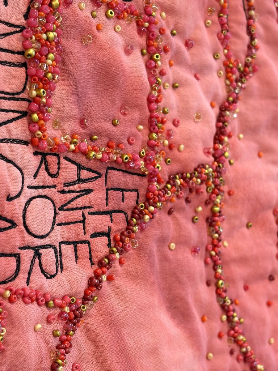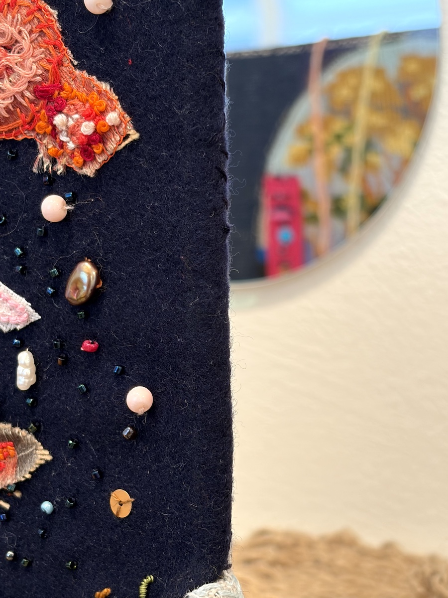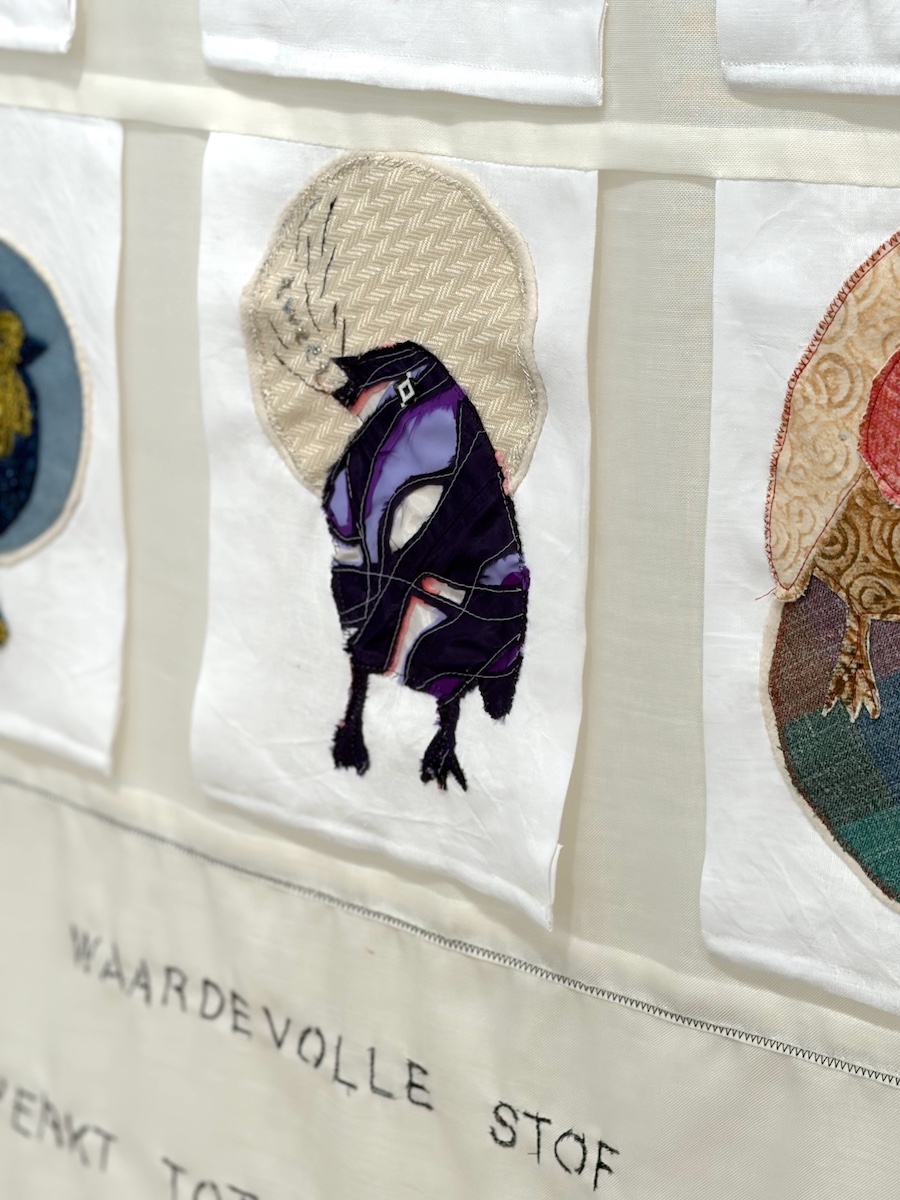 Mirjam werkt altijd met restmateriaal. Zo is de installatie gemaakt van oude borduurwerken van haar moeder, gecombineerd met stofresten van de kleding die ze naaide voor haar kinderen.