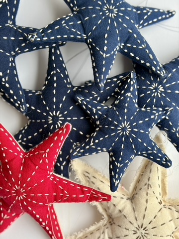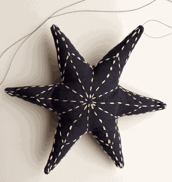 Het patroon van de Sashiko ster bestaat uit een regelmatige rijgsteek. Iedere lijn heeft een aantal steken, de buitenranden 8 steken, de 3 binnenlijnen 2x10 steken.