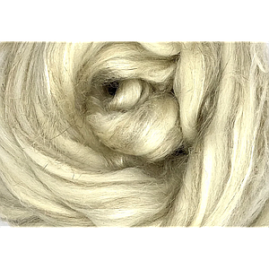 50 % Tussahzijde, 50 % Shetlandwol van ongeveer 30 micron.